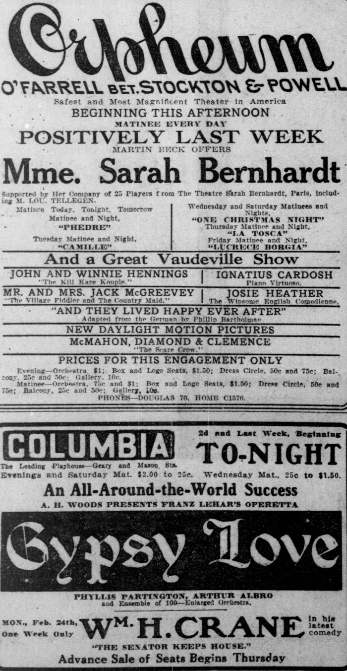 Sarah Bernhardt at the Orpheum Reginald McDonald RM — January 26, 2016 · Comments off Feb 1913 & Sarah Bernhardt at the Orpheum in SF. Camille and Phedre on one bill with a little vaudeville – Orch $1 orpheum sarah bernhardt
